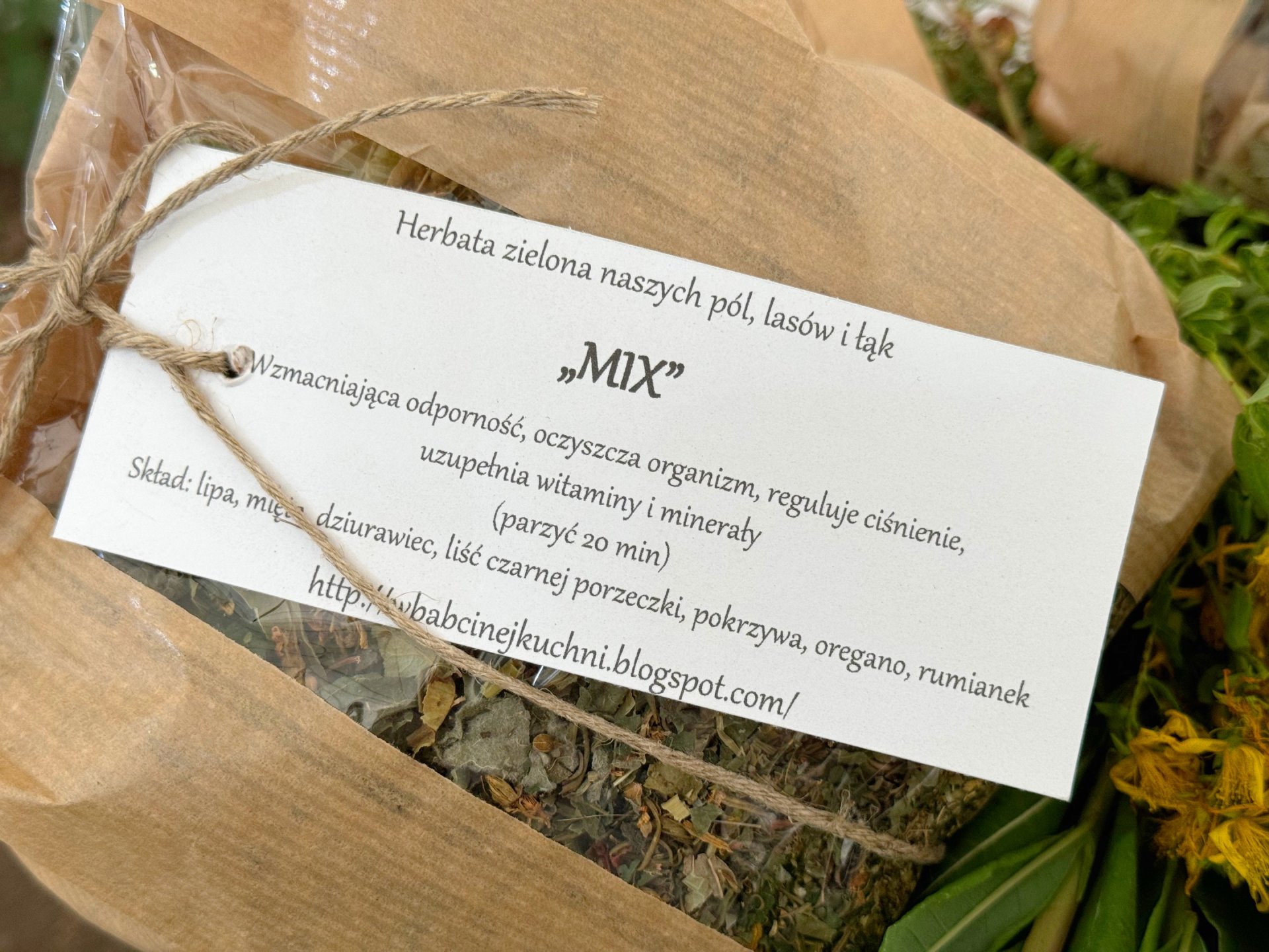 "Mix" - wzmacniająca odporność, oczyszczająca organizm, regulująca ciśnienie (skład: lipa, mięta, dziurawiec, liść czarnej porzeczki, pokrzywa, oregano, rumianek)